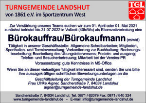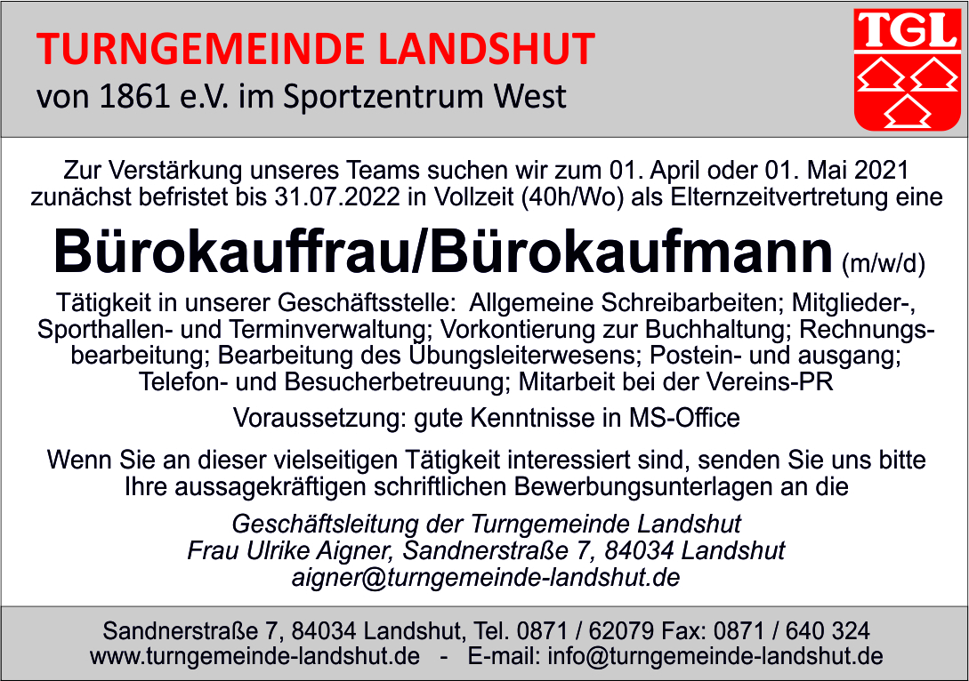 Die Turngemeinde Landshut sucht zur Verstärkung ihres Teams zum 01. April oder 01. Mai 2021