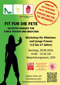 Die Turngemeinde Landshut hat heute noch einen tollen Tipp für alle Mädchen und jungen Frauen im Alter zwischen 13 und 17 Jahren, die TGL-Mitglieder sind: Am kommenden Samstag (28. September) von 10.00 bis 14:30 Uhr starten wir mit dem Workshop „Fit für die Fete“ ein Pilotprojekt im Rahmen der TGL-Gewaltprävention. Dieser erstmalige Kurs unter der Leitung der TGL-Gewaltpräventionsbeauftragten Sabine Zängerl ist einmalig kostenlos für unsere TGL-Mitglieder.