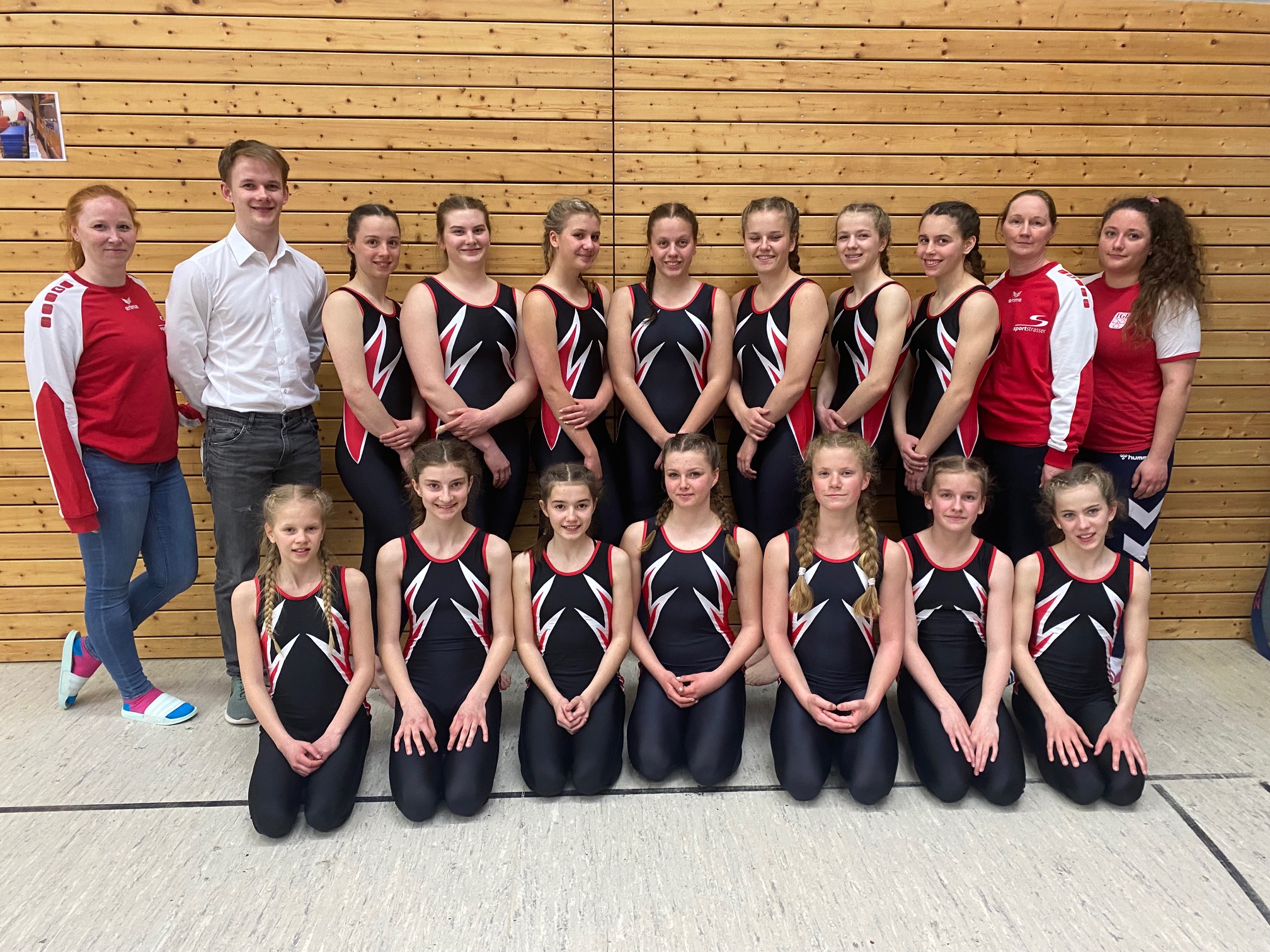 Bereits am Vormittag startete eine neu formierte Nachwuchsmannschaft in der Altersklasse 10-13 Jahren. Das Team mit Johanna Schreiner, Leonie Els, Lena Sternecker, Luise Galler und Lilli Ringert zeigten bei der Bodenchoreografie, auf der Tumblingbahn und am Minitrampolin durchwegs hervorragende Leistungen und holten sich am Ende völlig überraschend den Meistertitel im Schwäbischen Turnerbund!