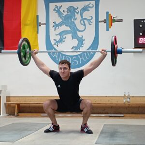 Der Neuzugang bei den Rot-Weißen Hebern, Maxym Brigidin aus der Gruppe der Ukrainer, die bei der Turngemeinde trainieren, musste außer Konkurrenz an die Hantel gehen, da der notwendige Startpass beantragt, aber noch nicht eingetroffen war. Bei seinem ersten offiziellen Wettkampf in der Altersklasse 30 – 39 Jahre, Gewichtsklasse bis 89 kg hätte er sicher eebenfalls den ersten Platz belegen könne. Er begann nervös, konnte nach zwei Fehlversuchen im Reißen mit 50 kg, diese Last dann doch noch sicher fixieren. Im Stoßen dann, nun betreut von Wolfgang Streinz, schaffte er eine gültige Serie von 70, 75 und 80 kg.