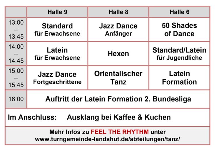 Wer schon immer mal mit dem Tanzen anfangen wollte, hatte am Sonntag, den 26.06.2022, in der Turngemeinde Landshut dazu die Möglichkeit. Mit 9 Tanz-Workshops bot die Abteilung Tanz unter dem Motto „Feel the Rhythm“ ihre Tanzstunden zum Reinschnuppern und Kennenlernen an.