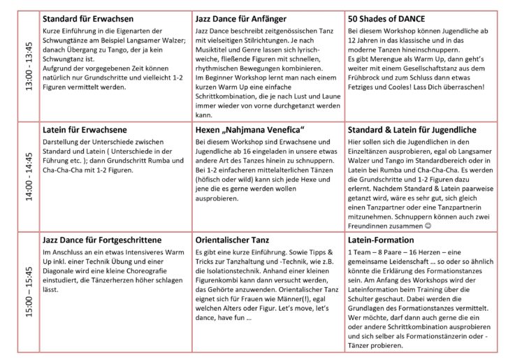 Erwachsene konnten in Jazz Dance für Anfänger und Fortgeschrittene, Einzeltanz Standard und Latein, Orientalischer Tanz und bei den Hexen „Nahjmana Venefica“ reinschnuppern. Jugendliche hatten die Möglichkeit, sich bei „50 Shades of Dance“ und im Einzeltanz Standard & Latein auszuprobieren. Für junge Erwachsene gab es auch noch einen Latein Formations-Workshop, hier konnte der aktuellen Lateinformation beim Training zugesehen werden und auch selber der ein oder andere Tanzschritt versucht werden.