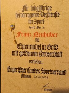 Anlässlich der TGL-Vereinsausschusssitzung am 03-. Juni 2024 im Sportzentrum West der Stadt Landshut überreichte Michael Wimmer als Vizepräsident Verwaltung/Organisation des Bayerischen Gewichtheber- und Kraftsportverbandes Herrn Franz Neuhuber