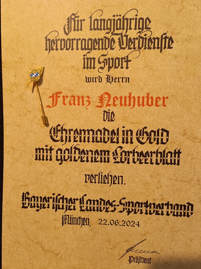 Goldene Ehrennadel mit Goldenem Lorbeerblatt des Bayerischen Landessportverbandes.