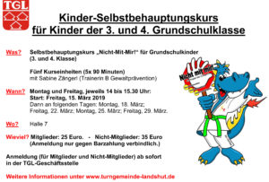 Aufgrund der großen Nachfrage: Die Turngemeinde Landshut bietet einen Selbstbehauptungskurs für Grundschulkinder der 3. und 4. Klasse an. Der Kurs umfasst fünf Einheiten mit je 90 Minuten und findet unter der Leitung von Sabine Zängerl, Übungsleiterin der Ju-Jutsu-Abteilung der TGL und Trainerin B Gewaltprävention, statt. Die Anmeldung für den Kurs – sowohl für Mitglieder als auch Nichtmitglieder – läuft ab sofort, die Teilnehmerzahl ist begrenzt.