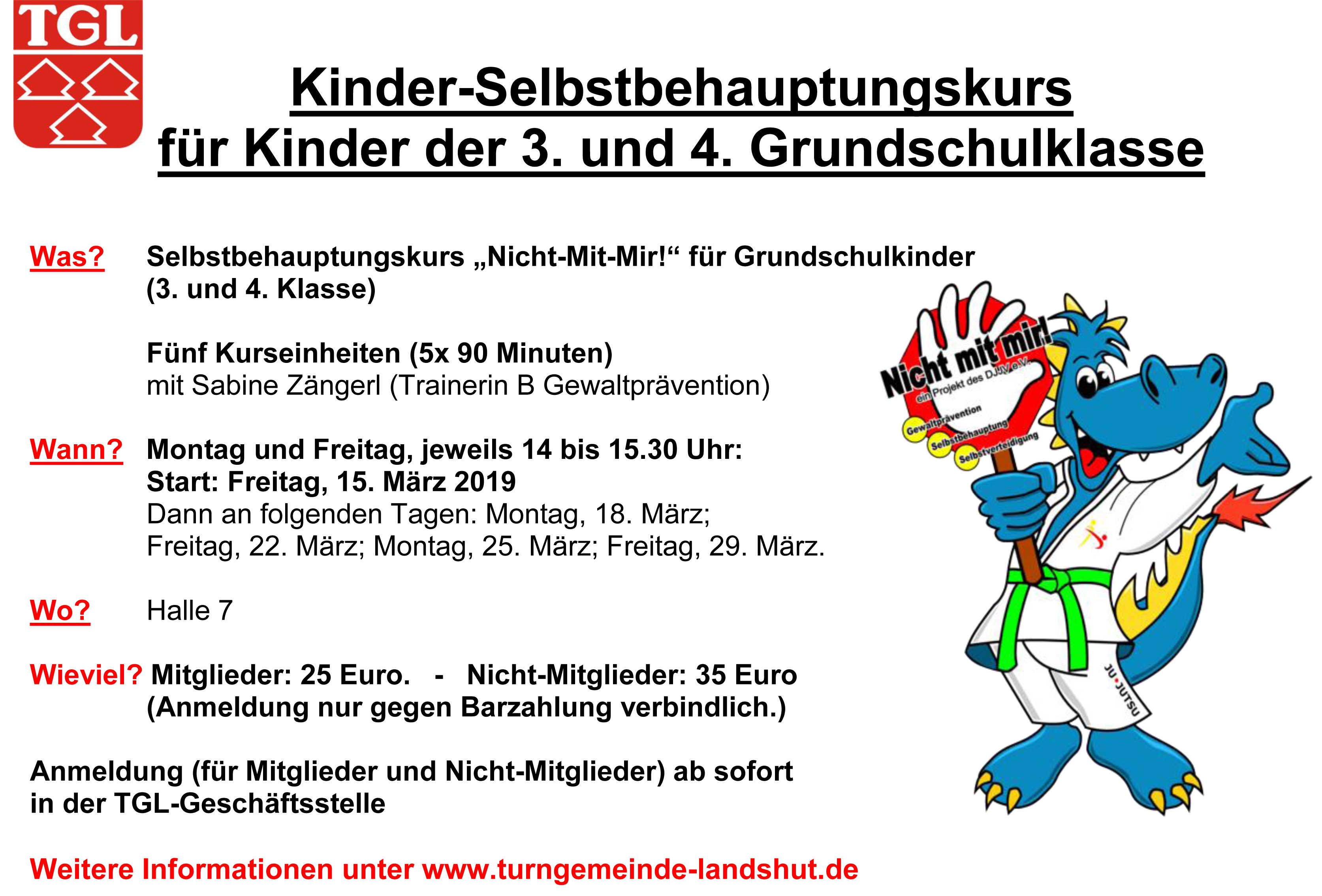 Die Anmeldung (gegen Barzahlung) erfolgt über die Geschäftsstelle der Turngemeinde Landshut, Sandnerstraße 7, zu folgenden Geschäftszeiten: am Montag und Mittwoch von 8 bis 12 und 13 bis 17 Uhr, am Dienstag und Freitag von 8 bis 12 Uhr und am Donnerstag von 13 bis 19 Uhr. Die Kosten für den „Nicht mit mir!“-Kurs belaufen sich bei den Grundschulkindern der 3. Und 4. Klasse auf 25 Euro (Mitglieder) und 35 Euro (Nicht-Mitglieder). Die Anmeldung ist erst nach Barzahlung in der Geschäftsstelle verbindlich.