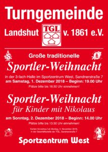 Die große Sportler-Weihnacht findet am Samstag, 1. Dezember 2018, um 19 Uhr statt, die Sportler-Weihnacht für Kinder mit Nikolaus am Sonntag, 2. Dezember 2018, um 14 Uhr, in der Dreifachhalle im Sportzentrum West. Die Verein verleiht an diesem Wochenende auch wieder den Jugendehrenpreis der Turngemeinde Landshut, gestiftet von der Familie Pöschl (Samstag), bzw. den Mannschaftsjugendpreis der TGL, gestiftet vom „Neuen Sport Strasser“ (Sonntag).
