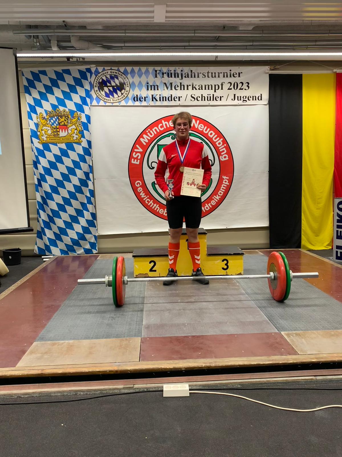 Leonard Brandl Simons beim Frühjahrsturnier der Bayerischen Gewichtheberjugend auf dem Treppchen