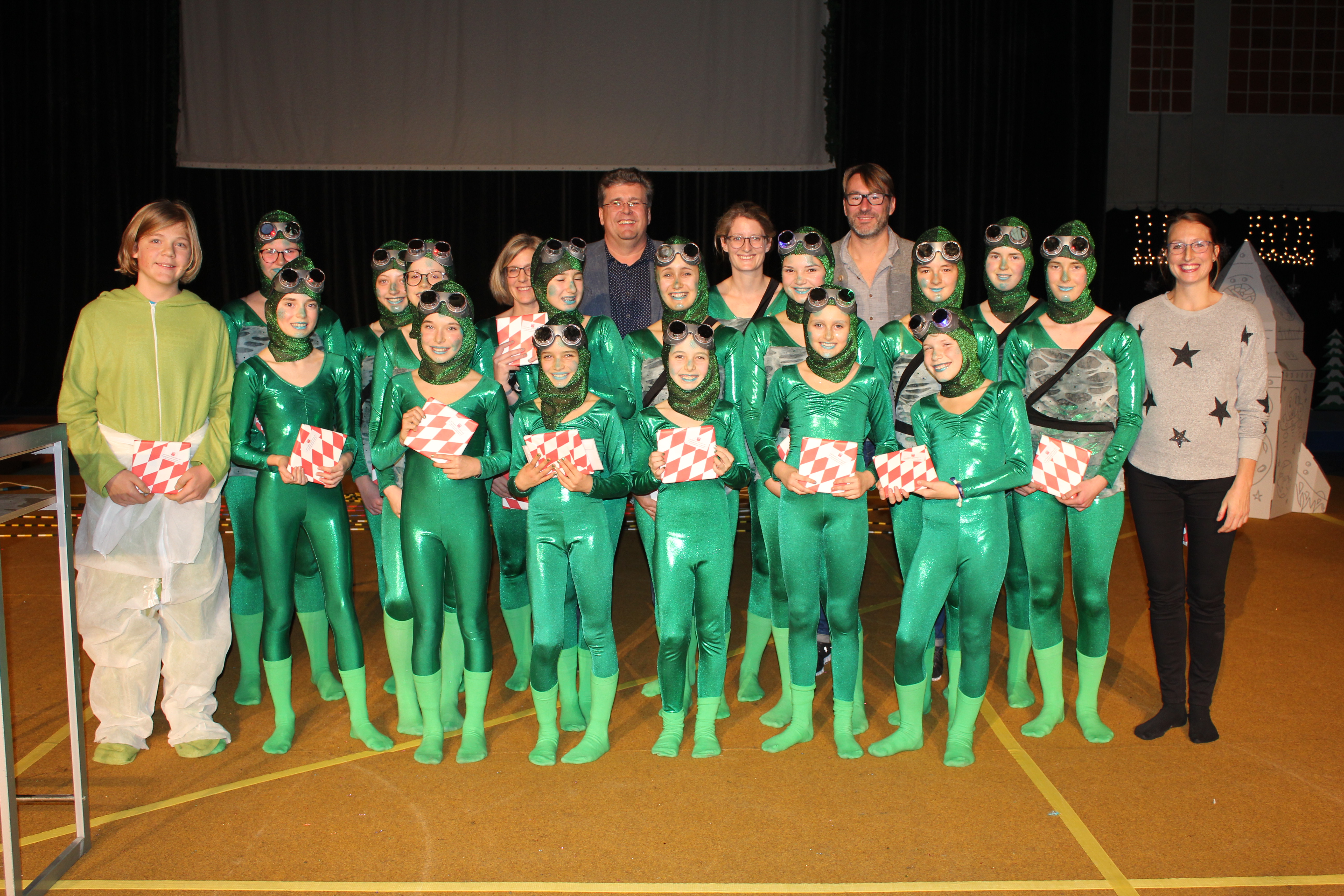 Geehrt wurden die 16 aktuellen „Grashüpfer“ Lorenz Forster, Katja Großmann, Agnes Großmann, Emma Peters, Jana Geith, Luzie Blumtritt, Mirja Gebauer, Nicole Shevchenko, Lisa Jarosch, Kathi Messerklinger, Antonia Meier, Hannah Schramml, Marie Schauer, Louise Goiny, Celina Beck und Lara Großmann mit ihren beiden Trainerinnen Julia und Steffi Frohnholzer. Die Ehrung nahm das Team bereits in ihren Kostümen ihres neuen Showprogramms „Ein Sprung zum Mars“ entgegen.