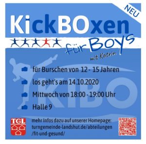 „KIBO für Boys“ ist bei der TGL ebenfalls ab Oktober neu im Programm und ist ein motivierendes und hocheffektives Ganzkörper-Workout für Jungs im Alter zwischen 12 und 15 Jahren. Dabei treffen Elemente des Kampfsportes auf die Basics des Aerobic- und Fitnesstrainings. Es ist ein Powerworkout zur Verbesserung der Kraft, Ausdauer, Beweglichkeit, Schnelligkeit und Koordination.