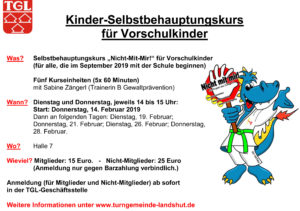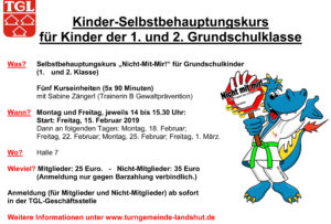 Die Turngemeinde Landshut bietet wieder zwei Selbstbehauptungskurse für Kinder – Vor- und Grundschulkinder – an. Die Kurse umfassen fünf Einheiten mit je 60 bzw. 90 Minuten und finden unter der Leitung von Sabine Zängerl, Übungsleiterin der Ju-Jutsu-Abteilung der TGL und Trainerin B Gewaltprävention, statt. Die  Anmeldung für die Kurse  – sowohl für Mitglieder als auch Nichtmitglieder – läuft ab sofort, die Teilnehmerzahl ist begrenzt.