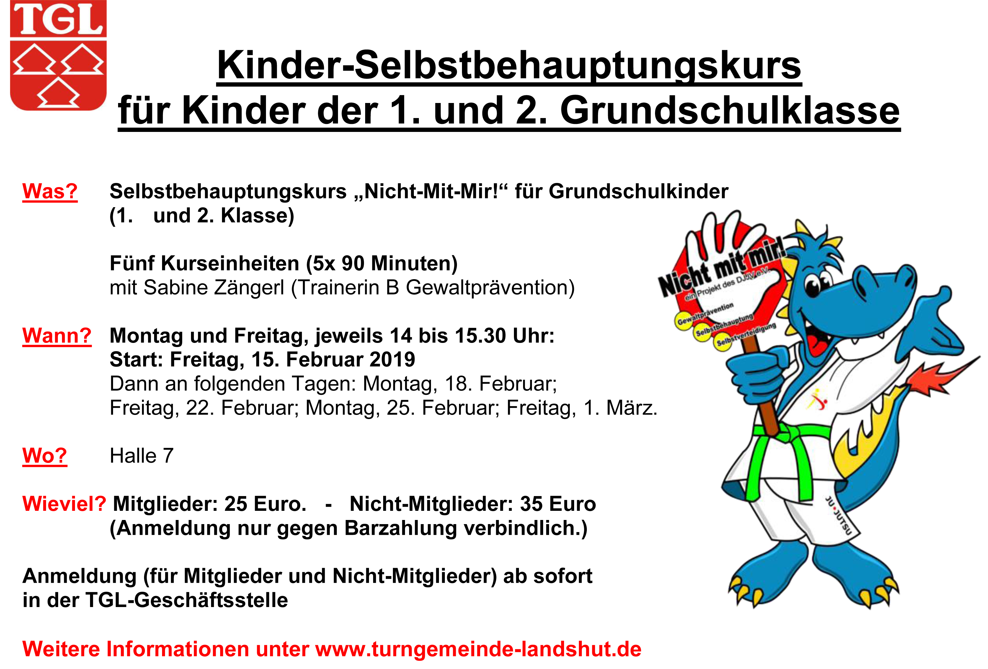 Die Anmeldung (gegen Barzahlung) erfolgt über die Geschäftsstelle der Turngemeinde Landshut, Sandnerstraße 7, zu folgenden Geschäftszeiten: am Montag und Mittwoch von 8 bis 12 und 13 bis 17 Uhr, am Dienstag und Freitag von 8 bis 12 Uhr und am Donnerstag von 13 bis 19 Uhr. Die Kosten für die „Nicht mit mir!“-Kurse belaufen sich bei den Vorschulkindern auf 15 Euro (Mitglieder) und 25 Euro (Nicht-Mitglieder) sowie bei den Grundschulkindern auf 25 Euro (Mitglieder) und 35 Euro (Nicht-Mitglieder). Die Anmeldung ist erst nach Barzahlung in der Geschäftsstelle verbindlich.